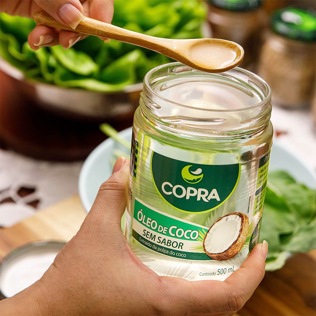 O Óleo de Coco Sem Sabor Copra foi desenvolvido com exclusividade para uso culinário. Com sabor neutro, é alternativa para outros óleos vegetais, pois além de ser zero gordura trans e não hidrogenado, possui em sua composição uma predominância de gorduras boas que facilitam a digestão e absorção pelo nosso corpo. Naturalmente rico em ácido láurico e TCM (Triglicerídeos de Cadeia Média), nosso Óleo de Coco Sem Sabor é extraído da polpa do coco sem adição de nenhum componente químico ou conservantes. Outro detalhe que faz a diferença no preparo dos alimentos, é que diferente de outros óleos vegetais, o Óleo de Coco Sem Sabor mesmo exposto a altas temperaturas mantém suas propriedades inalteradas, podendo ser usado como ingrediente culinário em diversas receitas doces e salgadas, além de fritar, saltear e temperar saladas sem alterar o sabor da sua comida.
